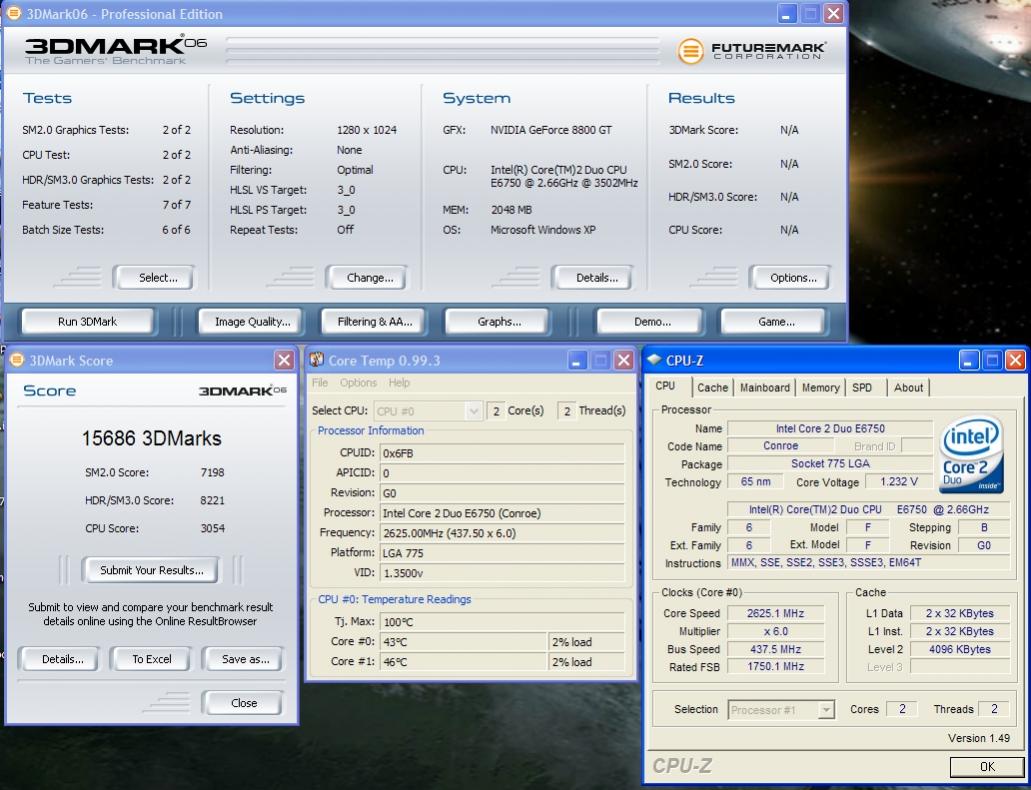 3DMark06 lief ohne Probleme durch und die Temps gingen auf max. 70 Grad. Besonderheit dabei die Gehäuseseitenwand war noch draußen, man weiß ja nie wann der Resetknopf fürs BIOS wieder benötigt wird. Ansonsten ringe ich immer noch mit mir ob Q6600 oder nicht!!!