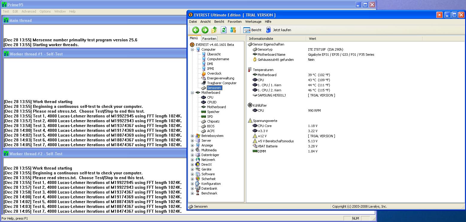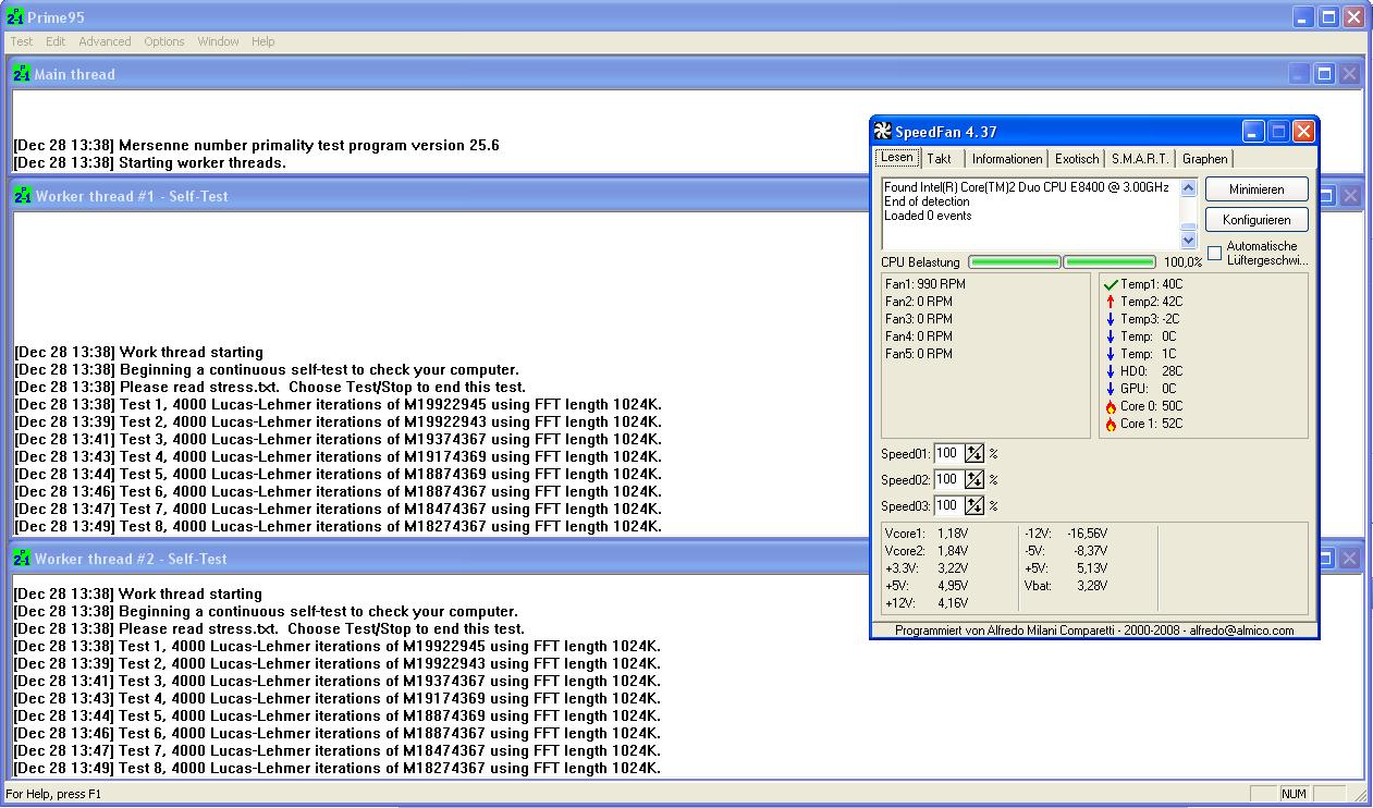 Sobald ich bei FSB400 manuell wieder auf 1,225v stelle, ist das System nicht stabil (Bluescreen!). Wenn ich auf 1,275v stelle, startet sie, jedoch bleibt bei prime95 1 Workthreat von 2 mit einer Fehlermeldung kurz nach dem starten wieder stehen. Immer wieder!