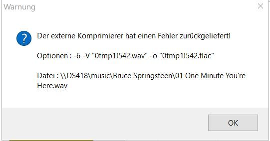Hallo! Versuche schon den ganzen Tag meinen externen Flac-Komprimierer ans Laufen zu bringen. Benutze EAC V. 1.5 und habe alle Einstellungen nach den bekannten Empfehlungen vorgenommen. Das Auslesen in wav funktioniert einwandfrei. Aber Flac.exe 4Win Vers. 1.4.3 macht Probleme. Nach jedem Versuch erscheint eine Fehlermeldung so wie im Anhang. Habe bereits jede Menge Kommandozeilen ausprobiert. Die letzte nur noch mit der Angabe für Quelle und Ziel. Aber es hilft nichts. Es erscheint zwar am Zielort der Eintrag für eine Flac-Datei. Doch wenn ich versuche, sie zu öffnen mit foobar, so erscheint der Fehler