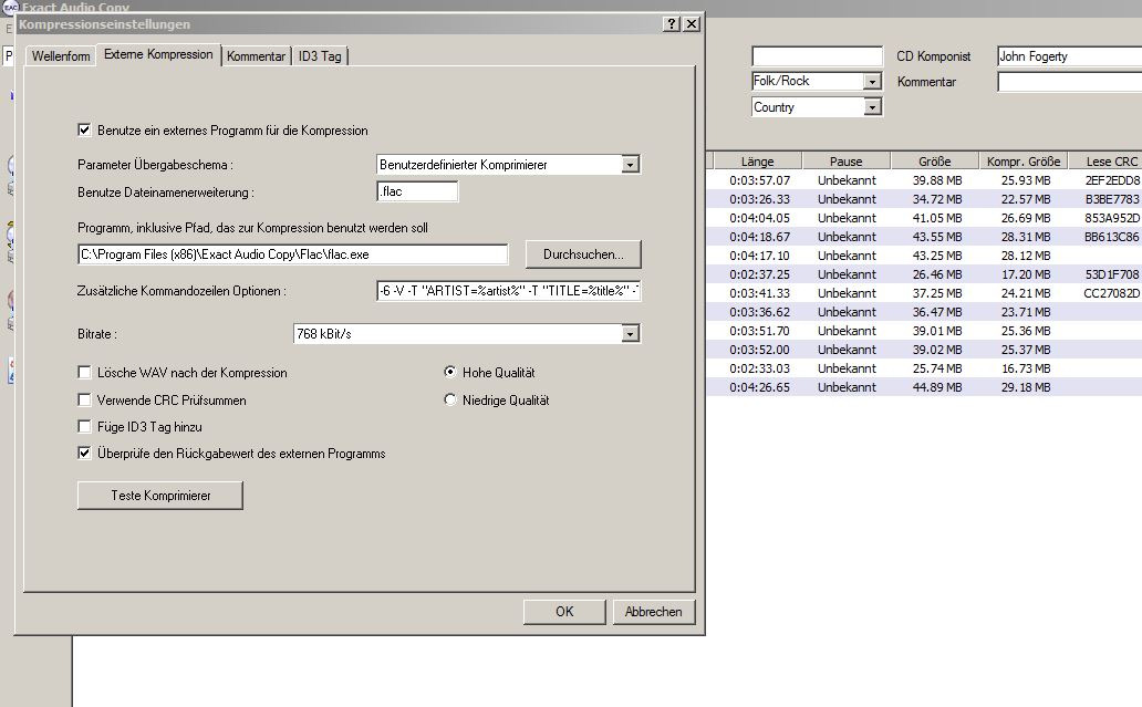 Hallo, ich bin neu hier und bemühe mich um die Problemlösung mit EAC: Trotz meiner Einstellungen, Kurzform: "flac", "nutze externen Komprimierer" (etc.) speichert das Programm entgegen der Vorgabe "WAV" und nicht "flac". Was könnte ich wo falsch aktiviert oder deaktiviert haben? Siehe Screenshots, Dankeschön!