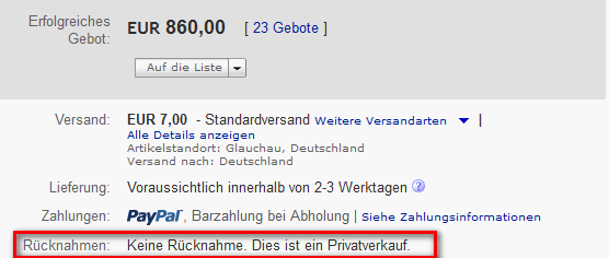 "Rücknahmen: Keine Rücknahme. Dies ist ein Privatverkauf" <- Ist so rechtens. Steht in den AGBs von ebay drin.