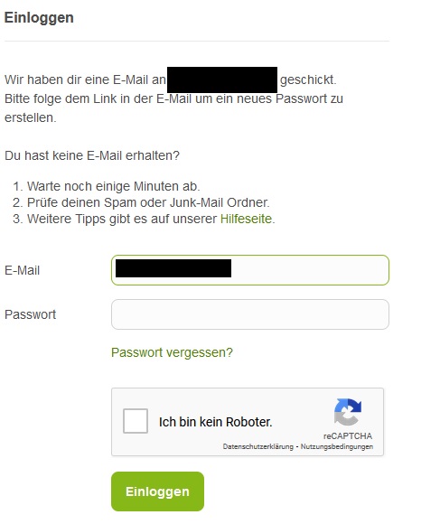 Ich habe jetzt bzw. in den letzten ca. 24 Stunden etwa 6 oder 7 Mal das Prozedere versucht, also nochmals versucht, mich mit dem bisherigen Passwort einzuloggen, um erneut die entsprechende Passwortänderungs-E-mail von EK zu bekommen, in der Hoffnung, dass eine solche diesmal ankommt ... Pustekuchen ...