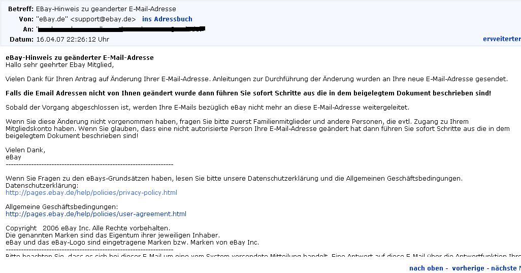 habe eben wieder eine gut gemachte Phishing Mail von "Ebay" erhalten nach der ich angeblich meine E-Mail Adresse bei Ebay geändert hätte