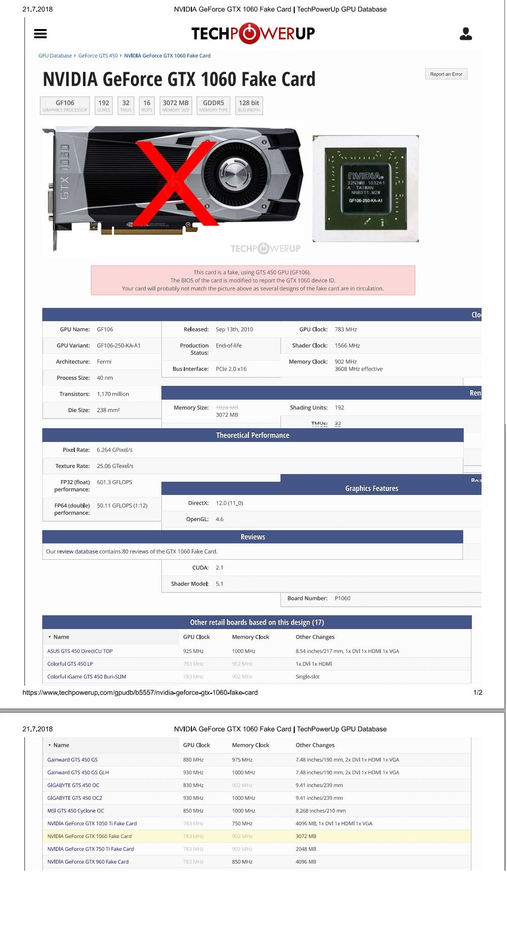 Während gebrauchte 1060er 3GB aus DE zwischen 140-220€ verkauft wurden, verkauften sich die Betrüger Karten von 50-120€. Die Karten im Bereich 50-100€ waren leicht als Fälschung zu erkennen. Darüber waren die Angebote trickreicher - die Bilder versteckten die SLI Brücke (1060 hat keine), die Anschlüsse wurden nicht gezeigt. Zudem wurden laufend Karten verkauft und immer neue Chargen eingestellt, keiner beschwerte sich, also kaufte ich.