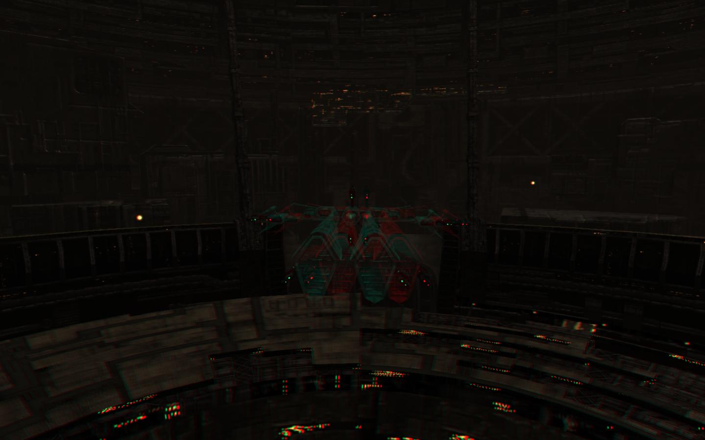 Der ist im normalen rot/cyan Modus mit der original Farbgebung und enthält daher ein rotes Schriftzeichen. Logischerweise erscheint das durch die cyan-farbene Folie nahezu schwarz, aber durch die rote Folie bekommt es für das andere Auge einen eher hellen Farbton. Das Ergebnis dieser Mischung aus dunkel auf dem einen Auge und hell auf dem anderen, ist ein merkwürdiges "flackern" bzw. "glänzen" des Schriftzeichens. Das Problem hat man mit allen Texturen, die rote Elemente enthalten: eigentlich sollte man sie für einen angenehmen räumlichen Eindruck auf beiden Augen in einem hellen eingefärbten Grauton sehen. Aber da alles rot im Bild nunmal durch die Cyan-Folie gezwungenermaßen zu einem schwarz/braun wird, verfälscht das den Eindruck.