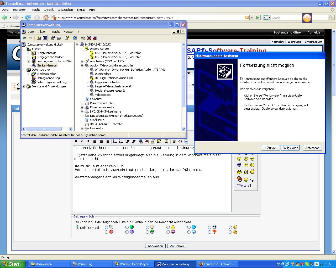 was ist denn im gerätemanager, ist sind da alle hardwaresachen einwandfrei installiert oder sind da sachen mit ner gelben warnung davor? stehen da die audio sachen überhaupt oder eventuell was von wegen unbekanntem gerät?