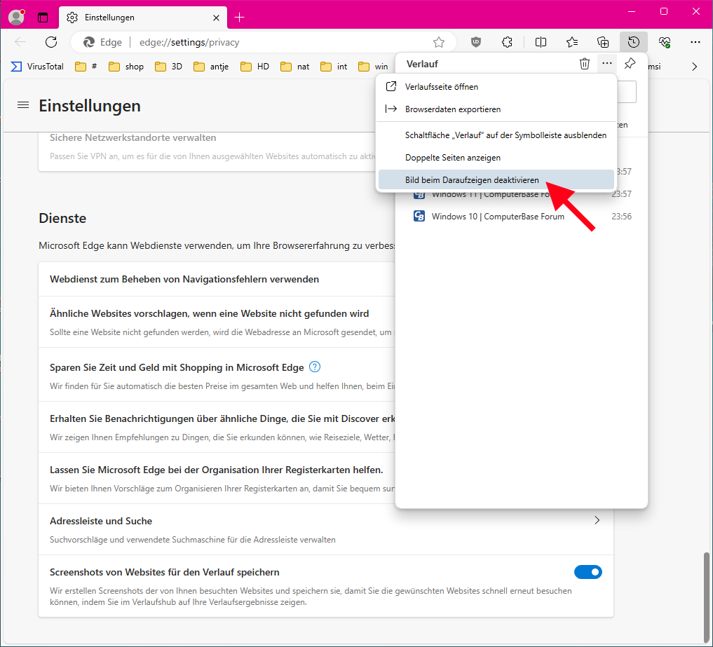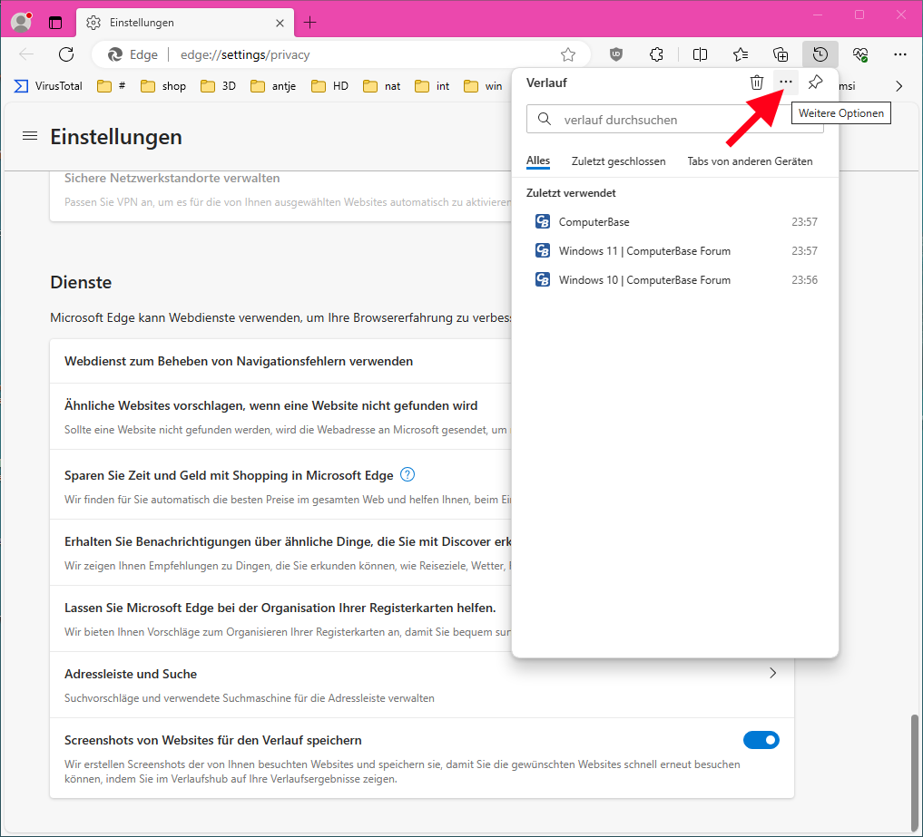 " Screenshots von Websites für den Verlauf speichern" ...bei mir lässt sich dieser Schieber nicht verstellen und ausschalten.
