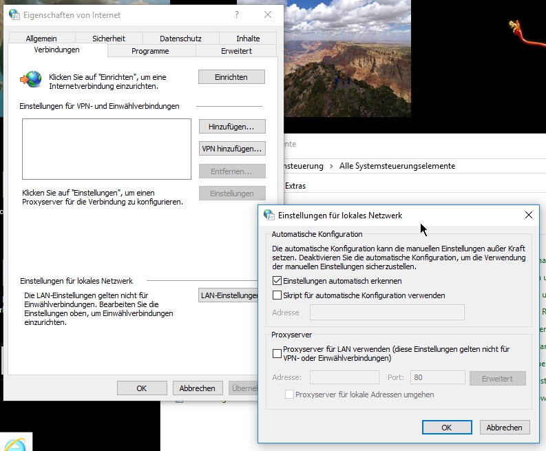 Systemsteuerung / Internetoptionen / Verbindungen / LAN-Einstellungen
