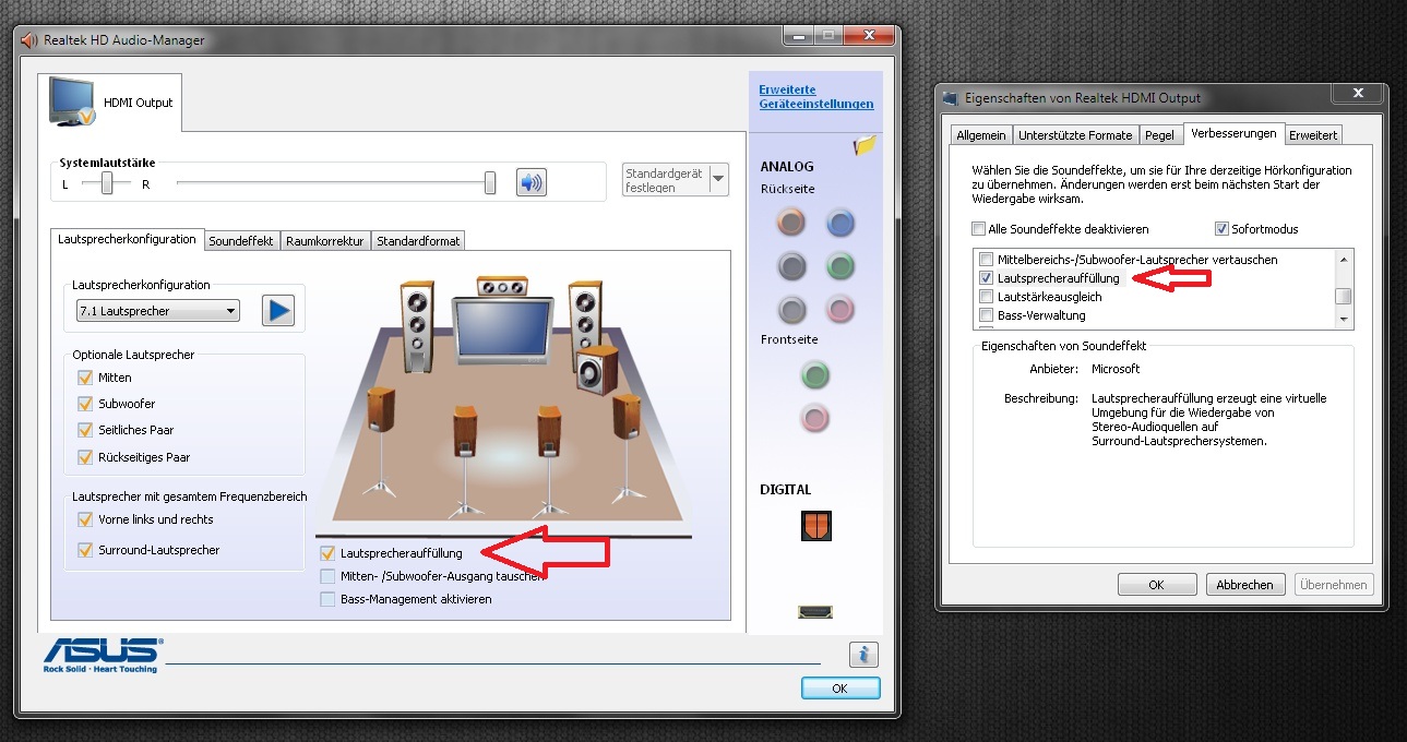 Wenn ich unter Windows 7 auf Start -> Systemsteuerung -> Hardware und Sound -> Sound gehe und dort den angeschlossenen Lautsprecher auswähle, dort in der Konfiguration 5.1 auswähle und einen test mache, dann höre ich aus JEDEM Lautsprecher den Testsound. Aber wenn ich eine MP3 Datei meines PC in WMP oder VLCP oder iTunes abspiele höre ich nur aus den beiden Front Satteliten + dem Subwoofer den Sound.