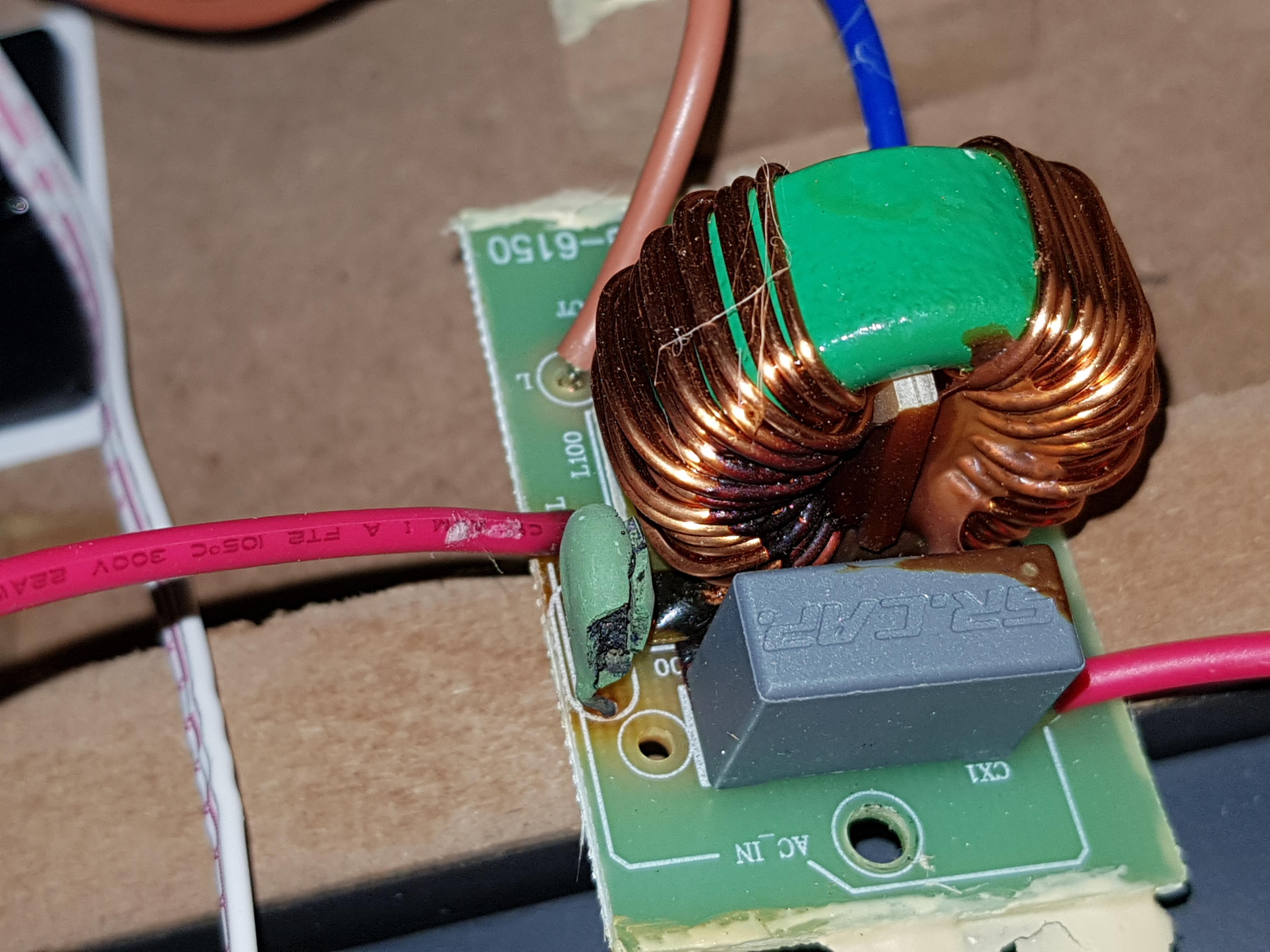 Die Spule ist so heiß geworden, dass die Isolierung geschmolzen ist, evtl Kurzschluss der Spule hat dann den Kondensator gekillt? Ist eine Vermutung aber da ist mehr im Eimer als man nur sieht.