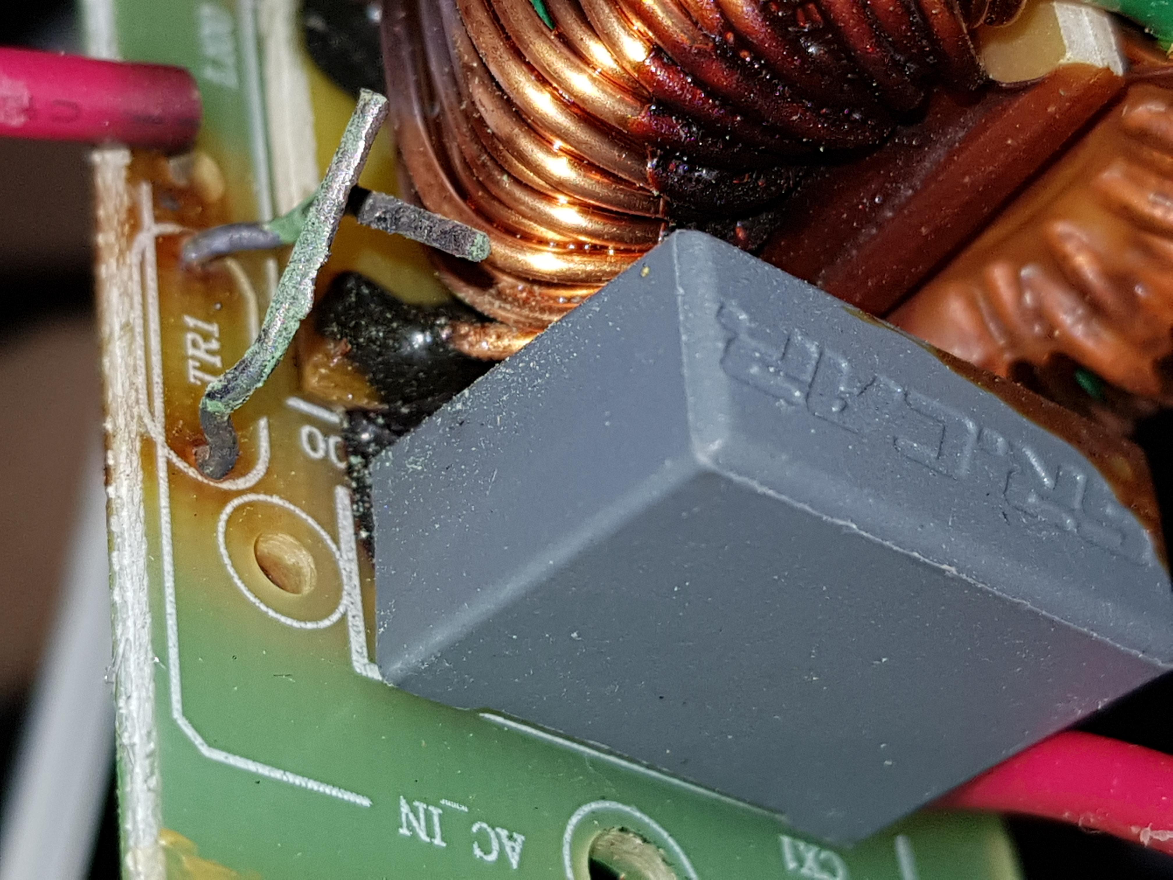 So wie es aussieht ist das grüne Teil (auf der Platine steht TRI) geplatzt. Leider weis ich nicht was das ist da ich nicht so tief in der Materie stecke.