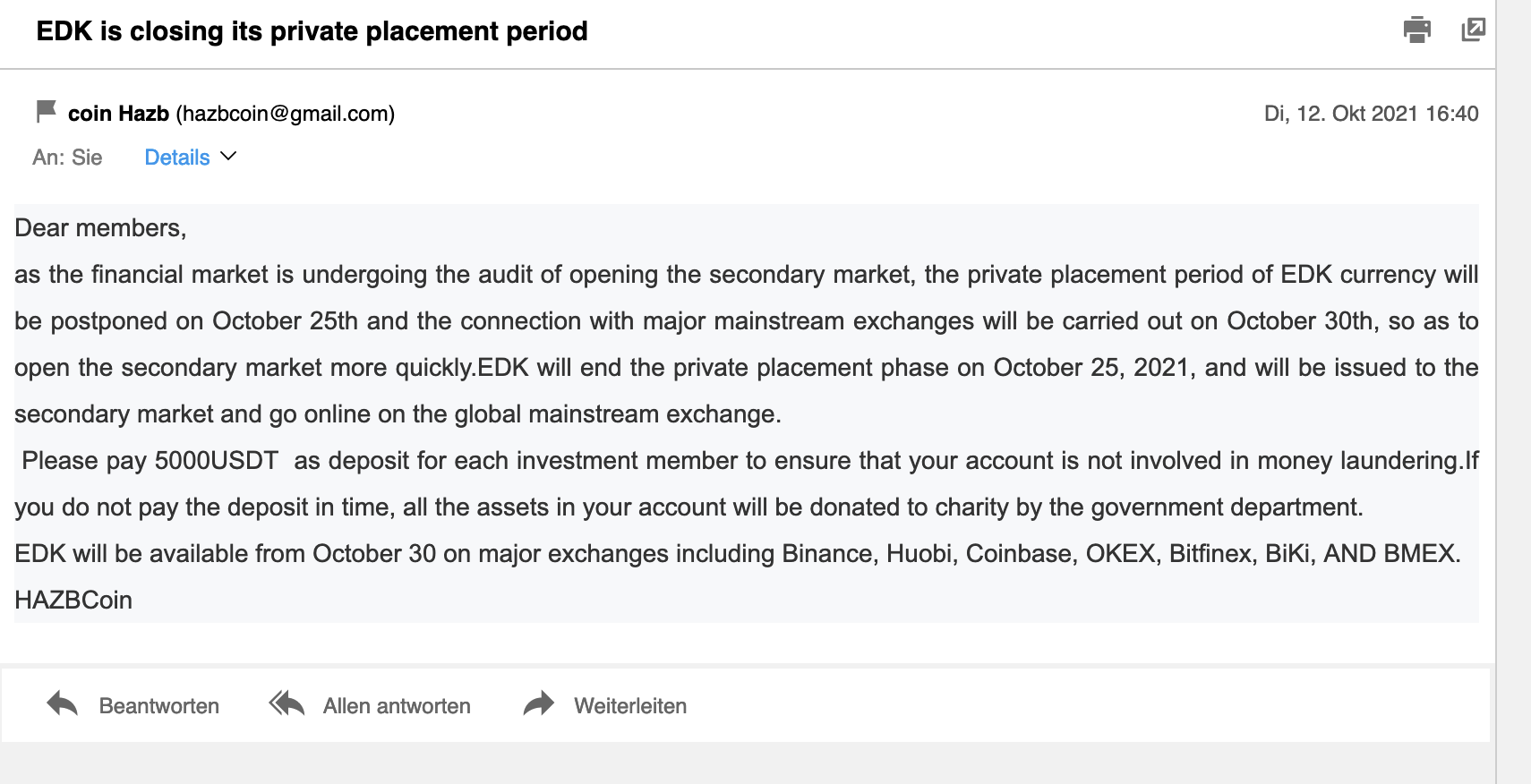 extrem schnell. Jetzt soll man 5.000 USDT einzahlen, um den Gewinn ab dem 25. Oktober abheben zu können. Ist das Fake oder kann das sein? Wer hat auch in EDK investiert?