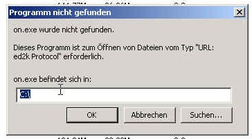 Seit neustem habe ich folgendes Problem: Immer wenn ich Serverlist über Link adden möchte kommt die Fehlermeldung das die sogenannte "on.exe" fehlt. Es geht dann ein Fenster auf in dem ich nach der Datei suchen kann, nur finde ich diese nirgends. Auf meinem anderen Pc wo edonkey auch noch installiert ist, ist diese exe auch nicht aufzufinden. Downloadlinks funzen auch nicht.