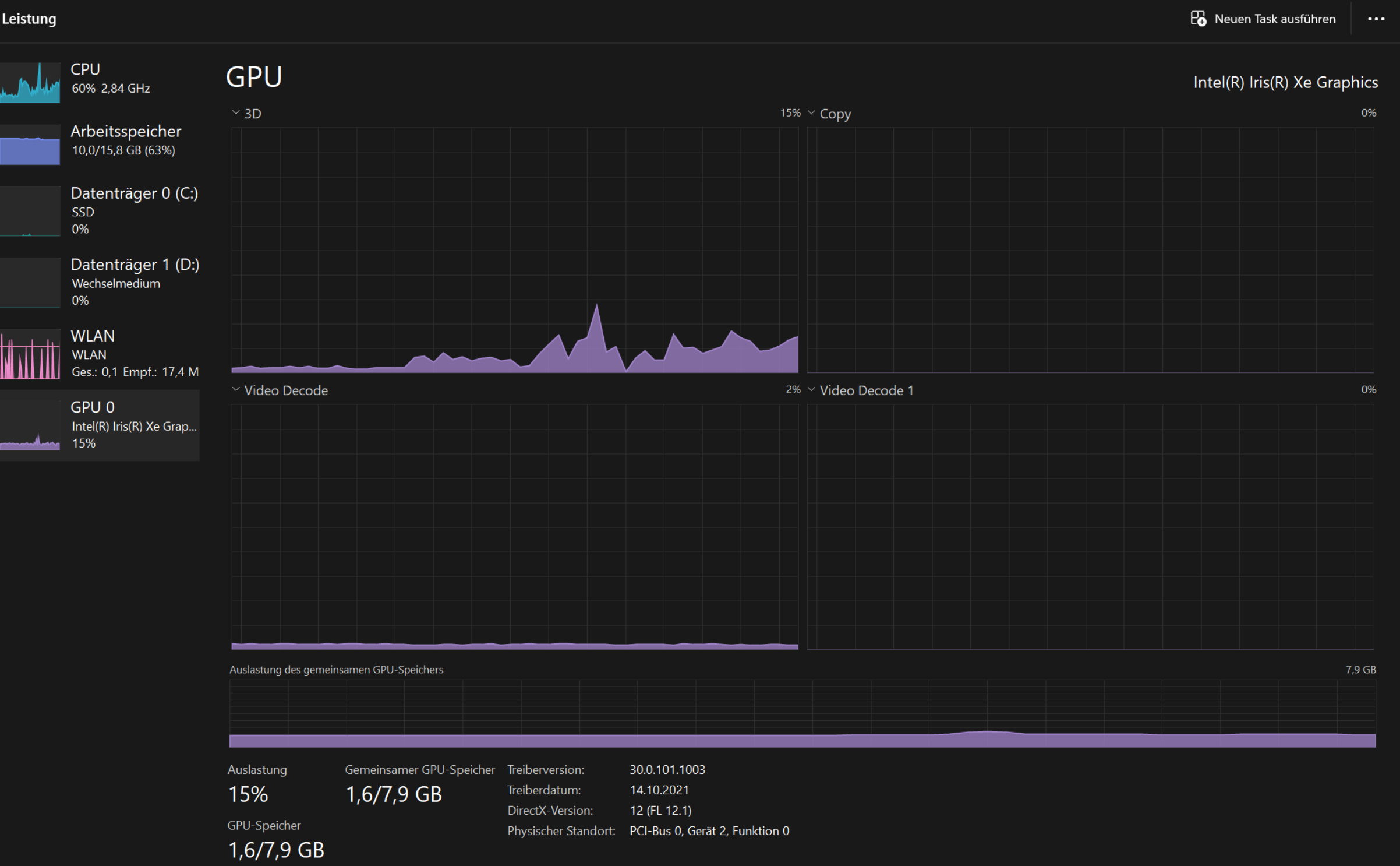 Wie ist die RAM Auslastung. Du hast keine GraKa. Wieviel RAM hat das Betriebssystem und wie viel nimmt sich die iGpu? Schich mal den Screenshot vom Task-Manager RAM und GPU.