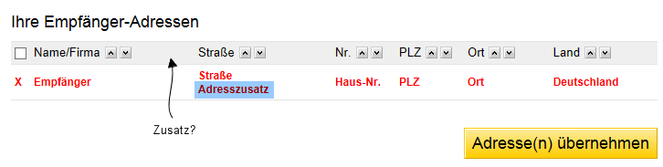 Wenn ich die CSV-Datei dann aber hochlade, wird das, was unter Zusatz steht, der Straße zugeordnet und die Adresse daraufhin als falsch gekennzeichnet. Scheinbar ist dort auch gar kein Feld für den Zusatz vorgesehen: