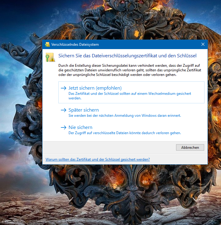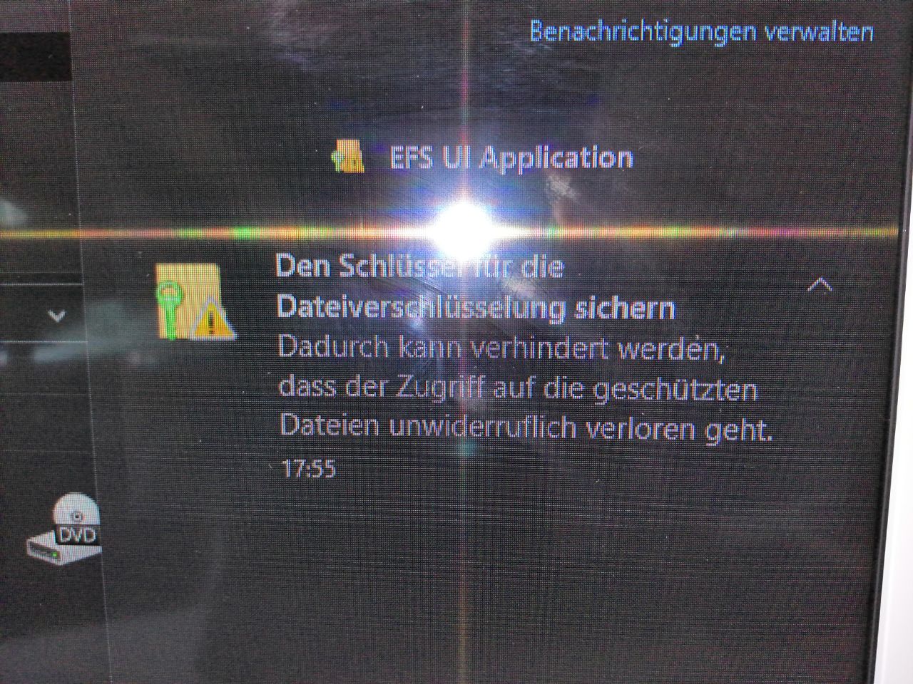 Hier popt gerade die Nachricht auf ich solle den "Schlüssel für die Dateiverschlüsselung sichern". Dadurch könne verhindert werden "dass der Zugriff auf die geschützten Dateien unwiderruflich verloren geht". EFS UI Application.