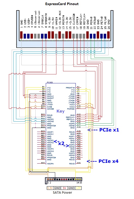 Die ganze Logik auf dem PE4L-Board braucht man anscheinend gar net, bisher läufts halt schonmal, d.h. die Grafikkarte wird erkannt!!! Steckerbelegung fürs Löten würd ich dann noch anhängen. Is halt bissl feinarbeit, aber ging besser als ich dachte mit dem Löten auf der Express-Card.
