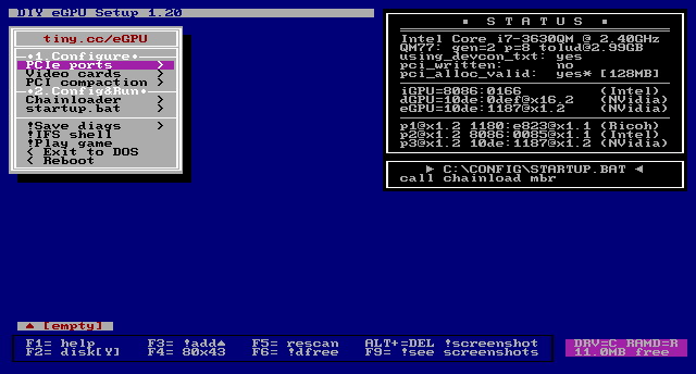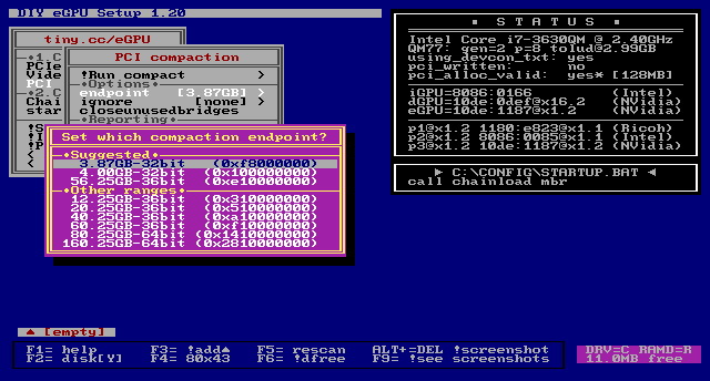 Auf der Hauptübersicht siehst du links deine Menüoptionen und rechts den aktuellen Stand deiner PCI-Konfiguration. Da steht der momentane TOLUD, "pci_alloc_valid yes*" ist der wichtigste Wert, an dem zu sehen kannst, dass alle PCI-ressourcen auch allen Geräten zugewiesen sind. Bei "no*" sieht man dann, dass etwas nicht stimmt bzw. man noch nicht fertig ist.