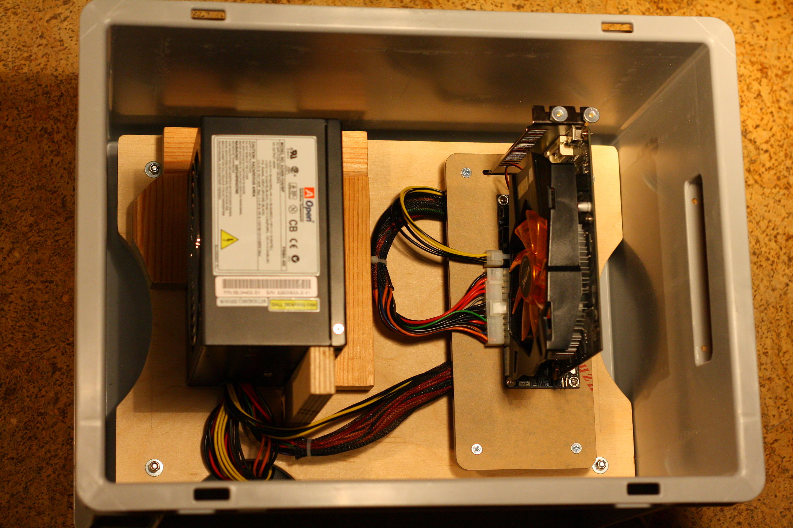 Ich werde in den nächsten Tagen noch eine GTX 960 bestellen um zu sehen ob ich die im Gehäuse vom Adapter unterbekommen kann, dann entfallen der Riser, Winkeladapter und Gehäuse auf jeden Fall.