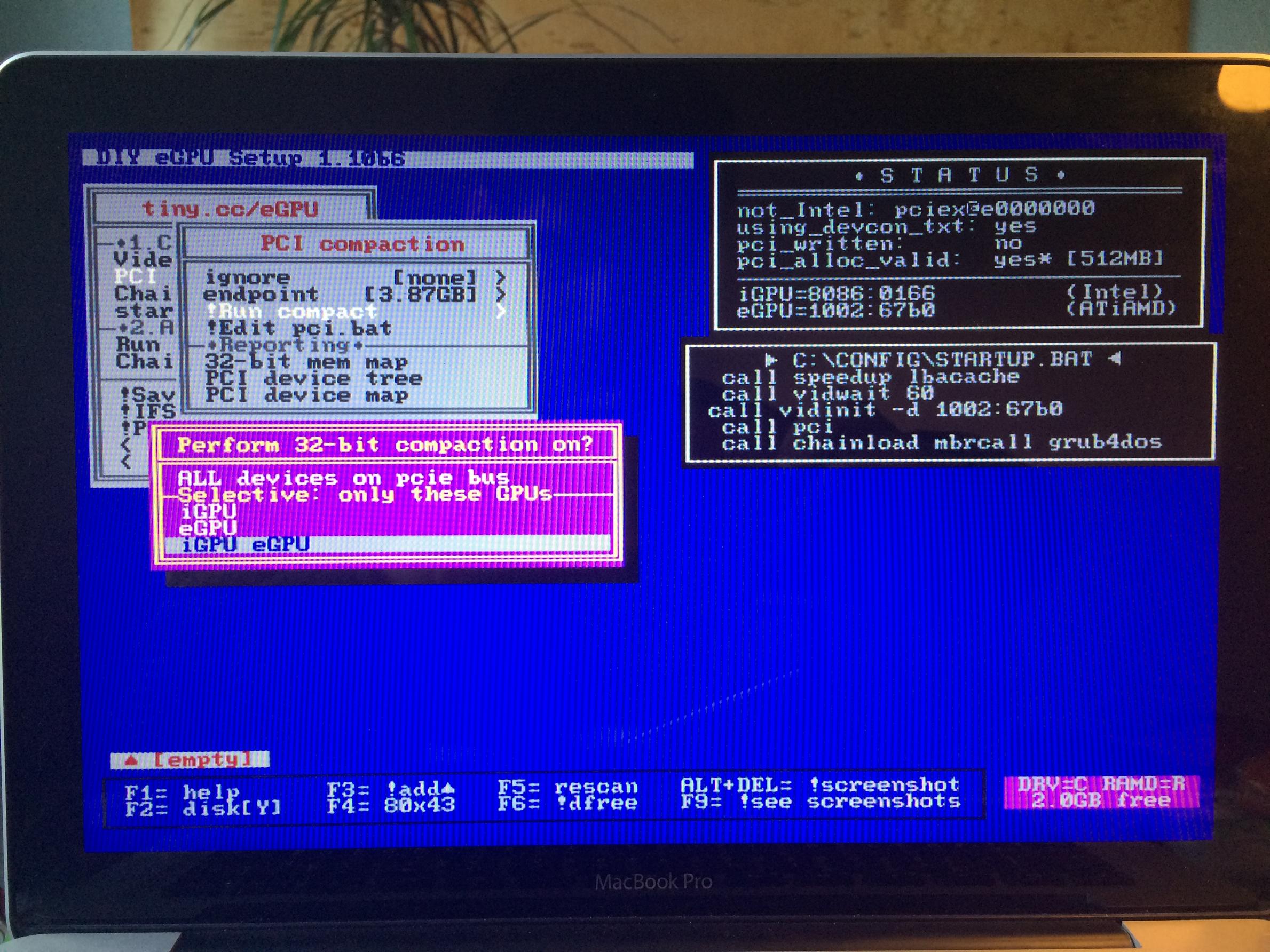 @Eisbrecher: Ich hab Version 1.10b6 und ich konnte die Compaction setzen, bin dann auch nach windows über den chainloader gebootet. Das Problem ist aber das die Karte überhauptnicht mehr im Gerätemanager erkannt wird. Ich bin dann auf folgende Seite gestoßen: http://egpu.maeth.net/faq.htm
