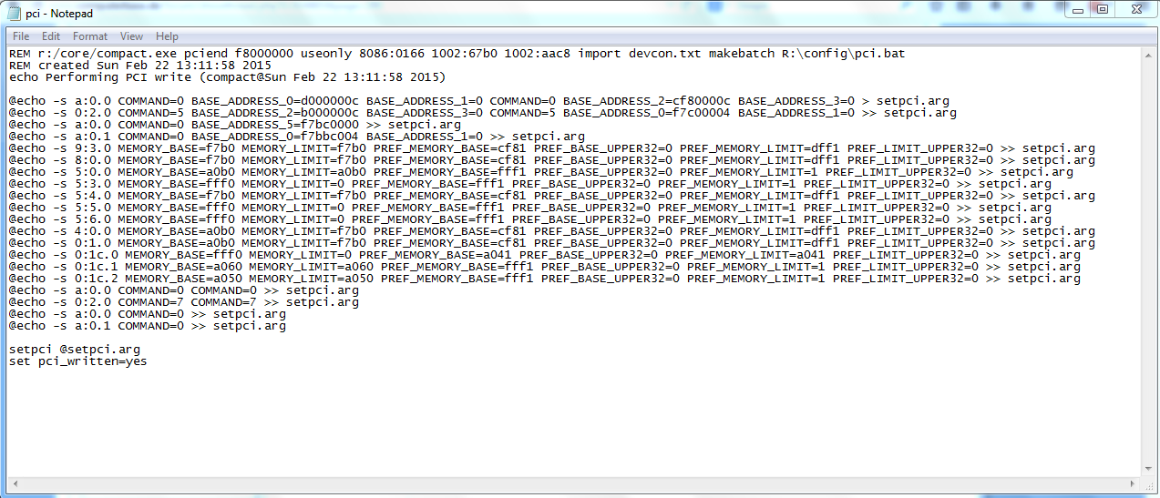 So the workaround is to change the 20 to be D0 and let Win7 have it's way. This can be done by adding two additional lines between your 'call pci' and 'call grub4dos' to override compact's allocation. This setting will override any further re-runs of compaction as well.