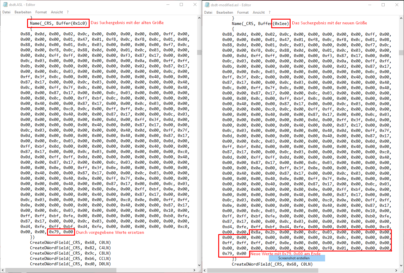 Code:c: & cd \dsdt acpidump -b -z "C:\Program Files (x86)\Windows Kits\10\Tools\x64\ACPIVerify\asl.exe" /u dsdt.dat copy dsdt.asl dsdt-modified.asl - Die Datei dsdt-modified.asl mit einem Texteditor deiner Wahl öffnen und dort nach "NAME(_CRS, Buffer(" suchen