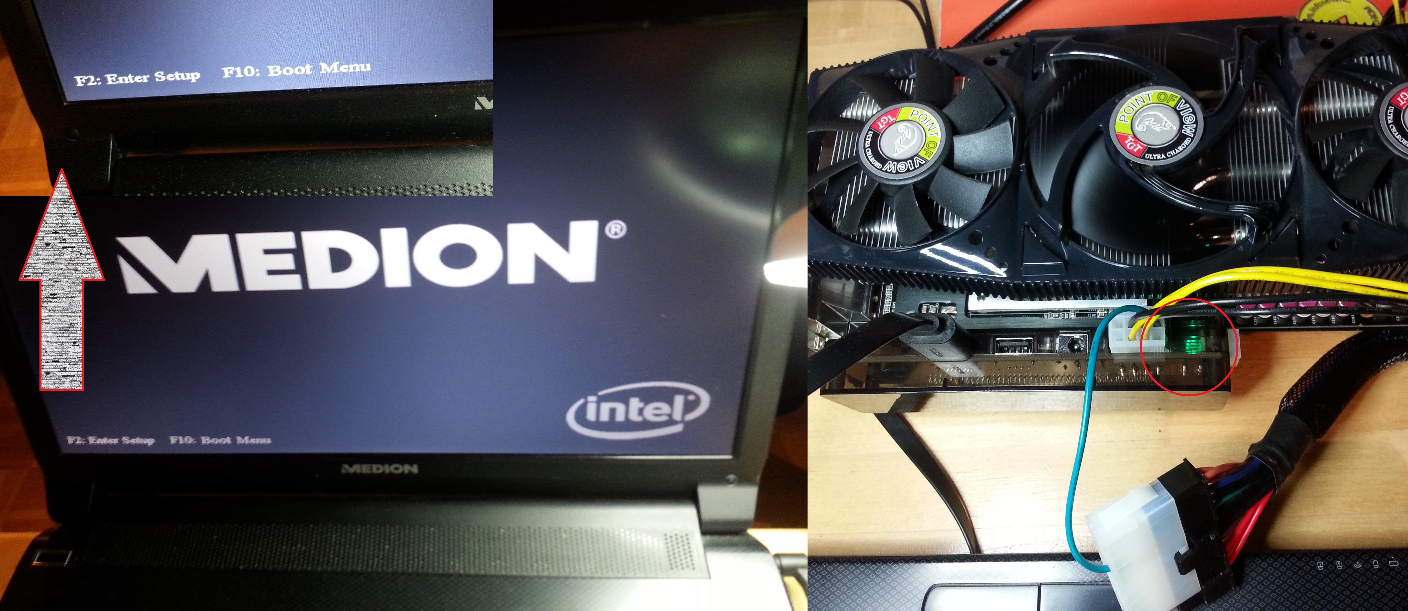 1.X201 mit eingestecker eGPU kalt starten, der Externe Monitor an der eGPU schaltet sich ein und meldet früh "System Configuration Data updated", nach dieser Meldung hart ausschalten, also Powertaste des X201 2-3sec drücken.