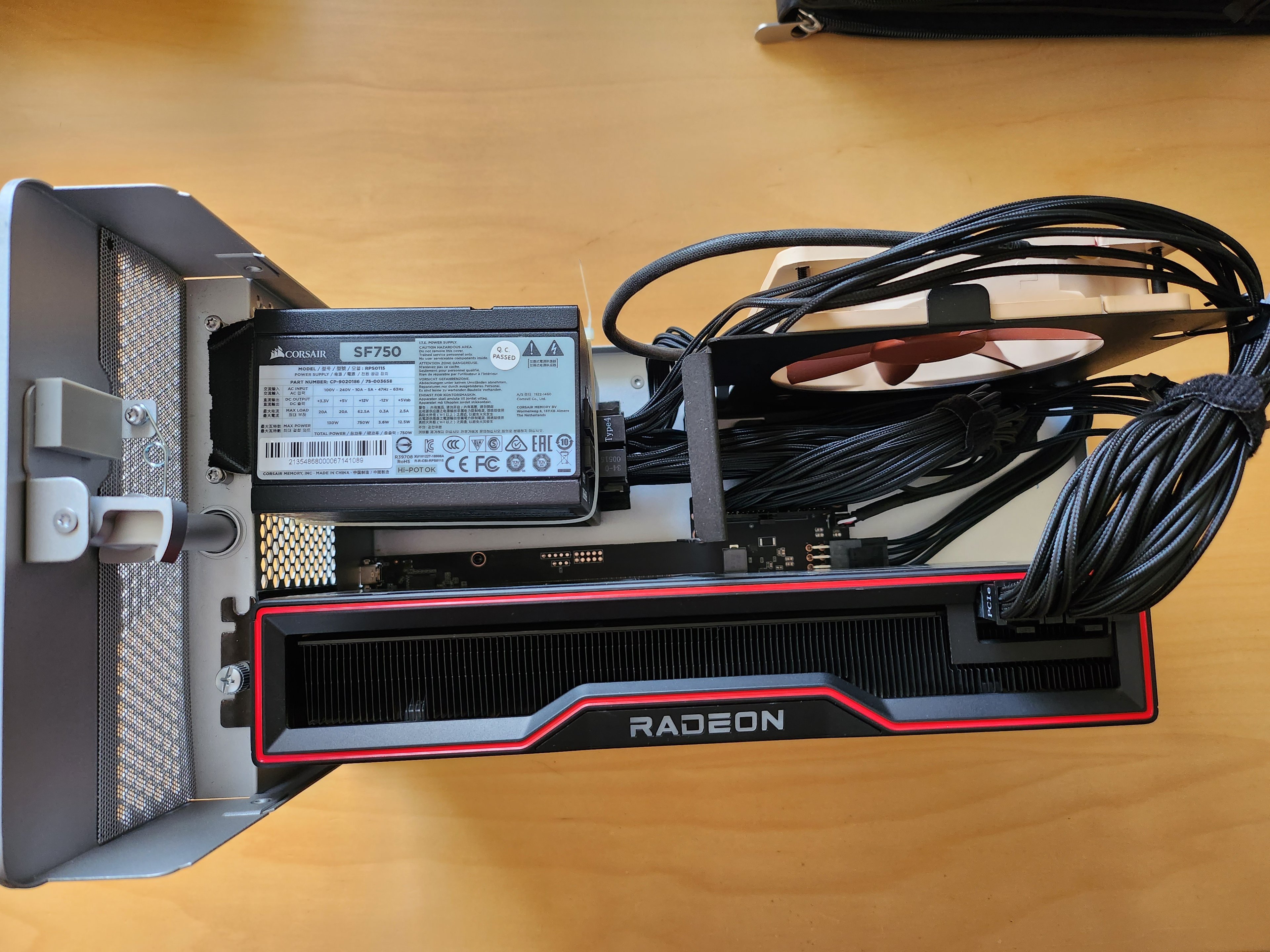 Das Razer Core X habe ich direkt leicht modifiziert und das Corsair SF750 wie auch einen Noctua NF-S12B Lüfter eingebaut.