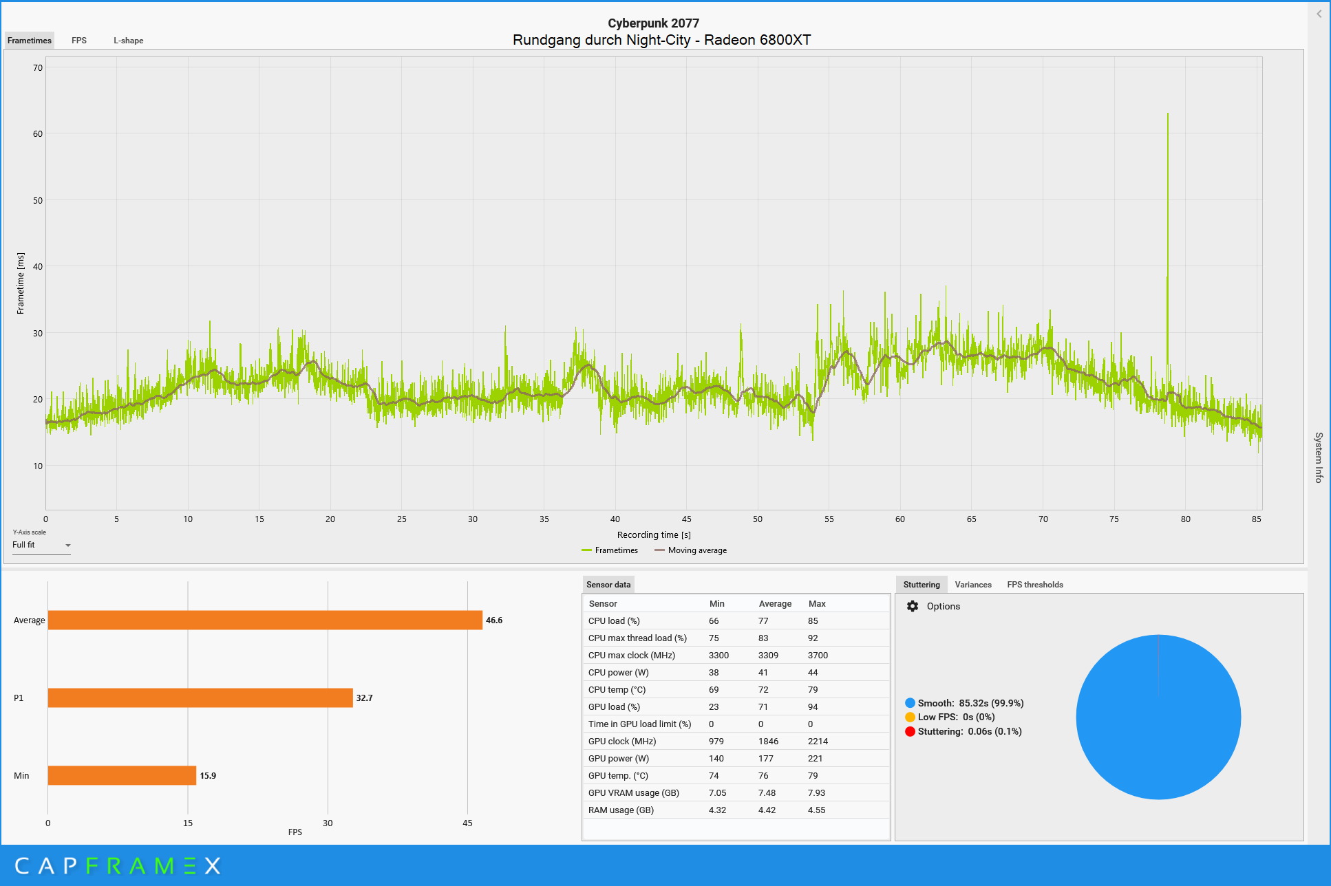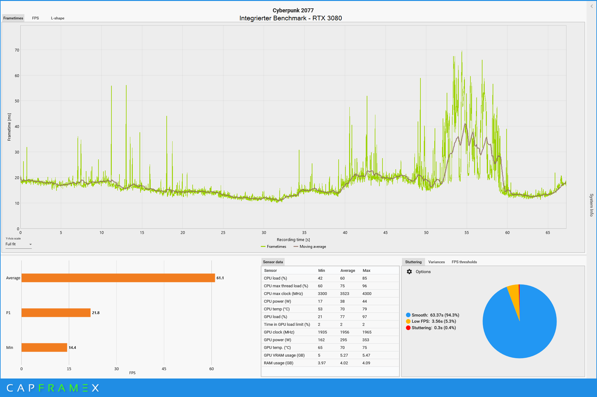 Hier habe ich einmal den integrierten Benchmark und dann eine eigene kleine Testsequenz mit einem Rundgang durch Night-City gemacht. (Ähnlich wie der Community Benchmark vom Witcher)