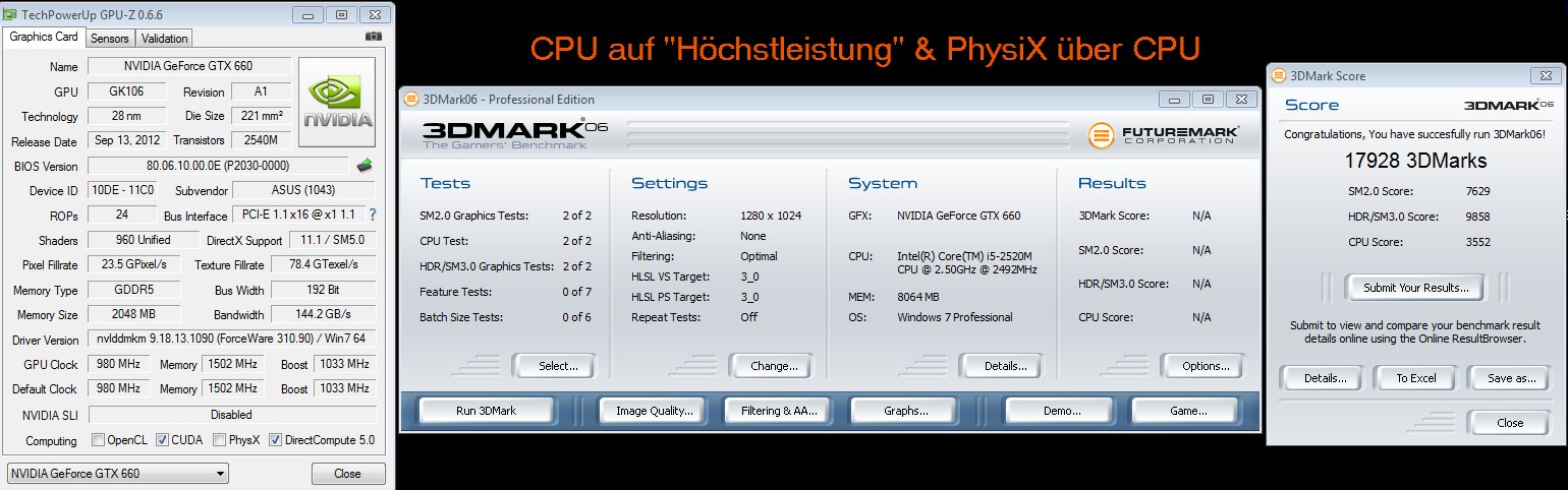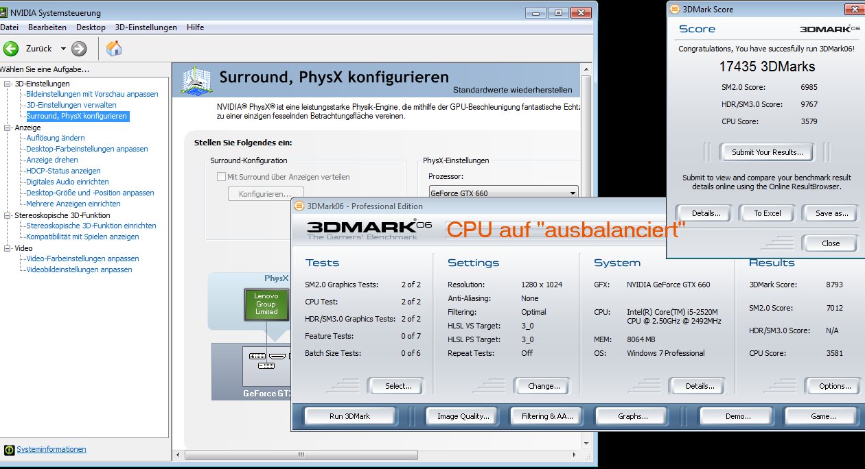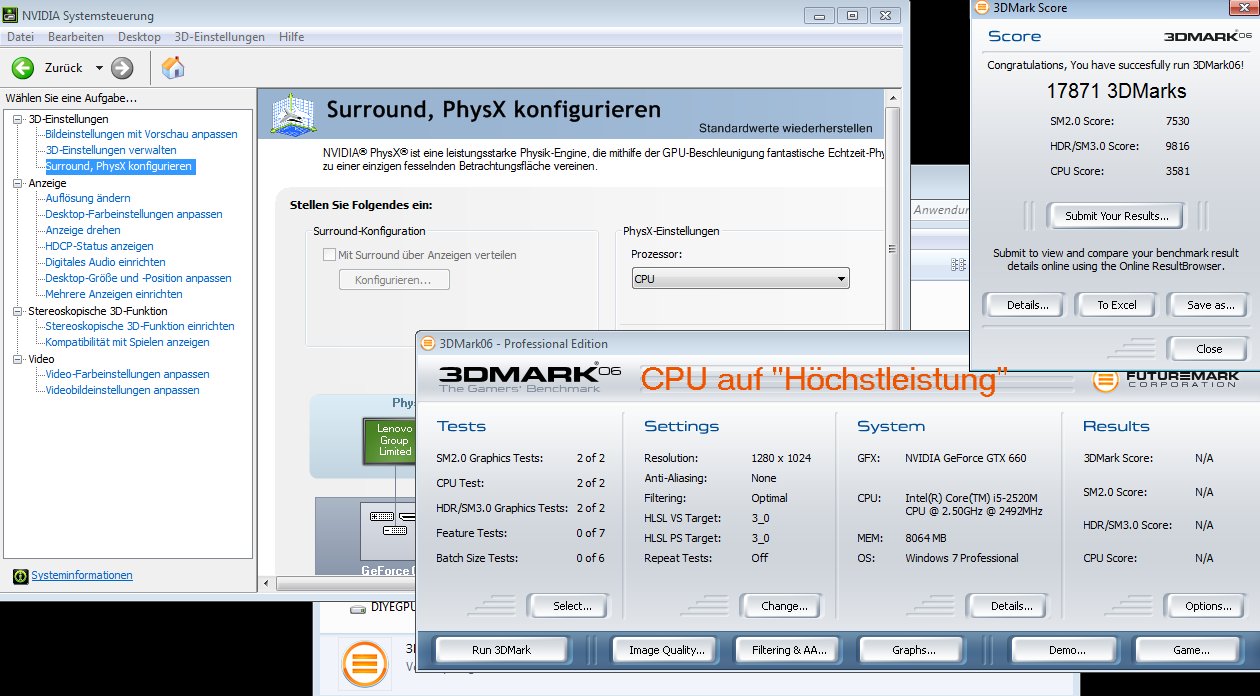 Also, meine Empfehlung: CPU als PhysiX Unit benutzen (NVIDIA Systemsteuerungen) und CPU auf "Höchstleistung" laufen lassen, macht man nichts verkehrt mit. Sobald ich das Problem mit den 2 Monitoren in den Griff bekommen habe bzw. ACPI-Fehlern, werde ich neue Benchs hochladen.