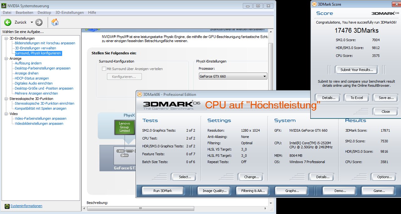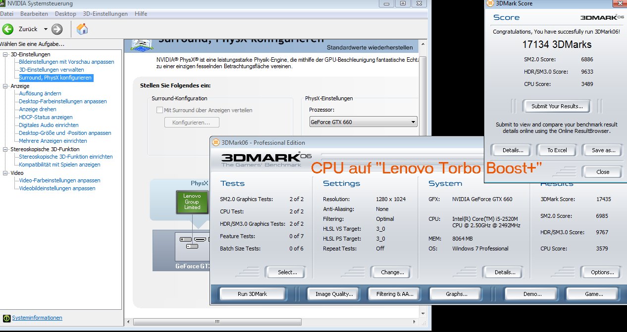 Sodele, trotz des Fehlers konnte ich mein System jetzt doch hochfahren und sieheda, es funktioniert sogar ganz ordentlich. Ich habe nun verschiedene Tests durchgeführt z.B. die PhysiX über CPU bzw. NVIDIA laufen zu lassen, da ich wissen wollte, wie sich dies auf die Übertragungsbandbreite von 2,5GBit auswirkt. Ergebnis: Lasst die CPU lieber die PhysiX-Arbeiten übernehmen, es kostet im Schnitt knapp 600 Pkt. im 3dMark06 Test die NVIDIA rechnen zu lassen. Weiterhin für Lenovo Nutzer: Zwar gibt es die Mgl. "Turbo Boost+" zu verwenden (man sollte denken, dass mehr CPU Performance auch bessere Ergebnisse brächte, aber: Pustekuchen), davon rate ich ab, da die Leistung im Test dadurch negativ beeinflusst wird. Ansonsten lief mein System sechsmal durch den Benchmarktest und lieferte relativ konstante Ergebnisse (je nach Konfiguration); 17100-18000 Pkt ist der Messbereich. Mit Kühlpad liegt die Temperatur der CPU immer unterhalb der 90°C (für nen Hochperformance Test über ne Stunde gesehen akzeptabel).