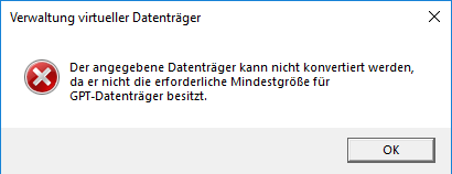 Der angegebene Datenträger kann nicht konvertiert werden, da er nicht die erforderliche Mindestgröße für GTP-Datenträger besitzt.