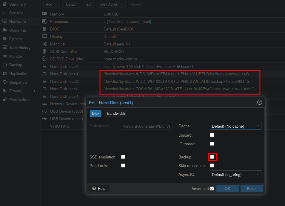 Ich plane ein NAS in Eigenbau zu realisieren. Darauf soll Proxmox und das Betriebssystem für das NAS sowie weitere Container laufen. Meine Idee ist, zwei SSD 1TB mit Raid 1 für die Container aufzubauen, so dass die Container direkt gespiegelt werden. Des Weiteren wollte ich zwei 14 TB Platten ebenfalls im Raid 1 Verbund laufen lassen.