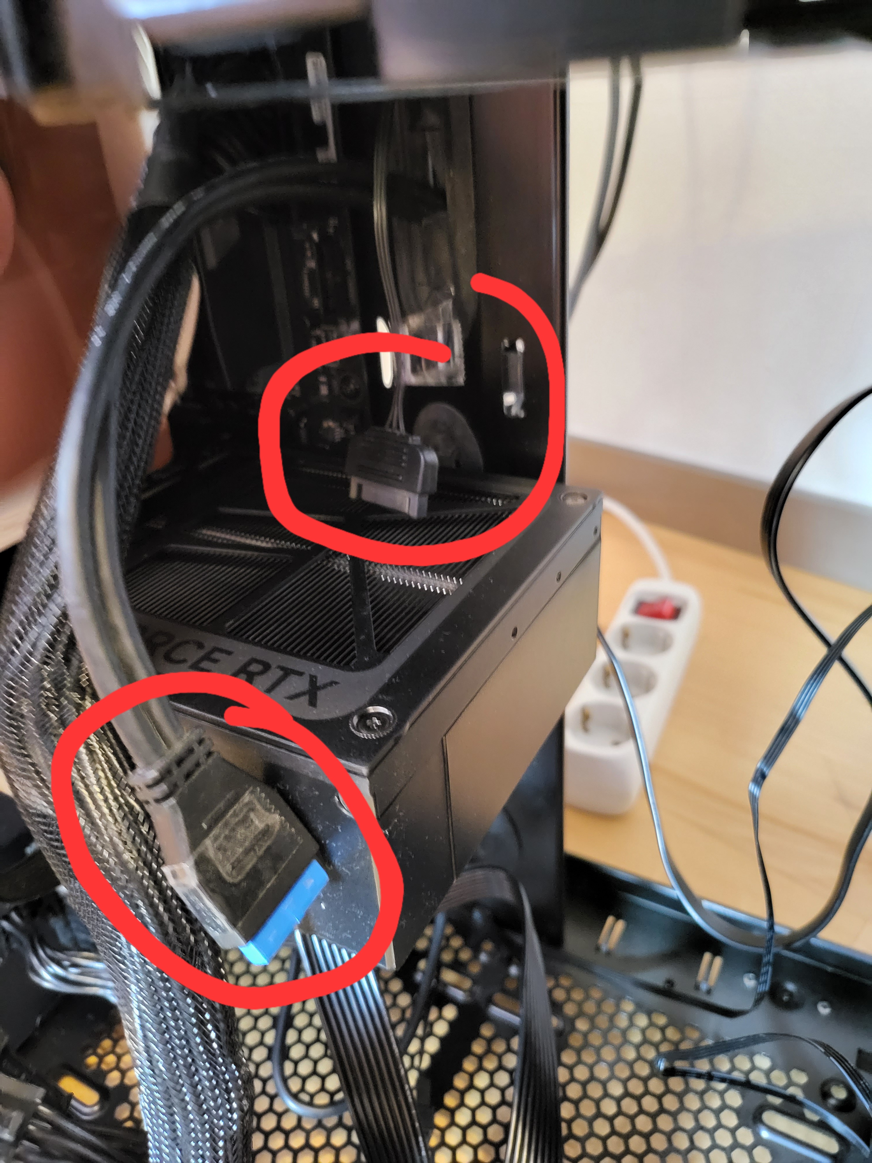 Edit: Ich sehe jetzt erst dein edit, das oben ist das falsche Kabel, da muss ein passendes sein, da darf nichts frei bleiben, evt. muss man zwei zusammenhalten, schau mal in die Anleitung vom Netzteil.