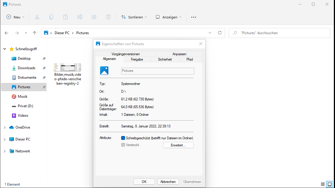 Als ich die Ordner "Eigene Dateien" insbesondere den Unterordner "Eigene Bilder" (Pictures) von dem Standardpfad in Windows 11 auf eine neue Partition ("D: Privat") verschieben wollte, hat Windows erst die zwei Unterordner aus Pictures auf Partition "D: Privat" verschoben.