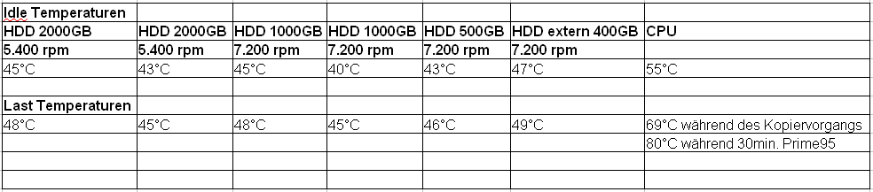 Zur Verfügung stehen mir insgesamt 8TB (4x2TB Samsung F4 Green) und eine SSD mit 40GB (noch nicht vohanden, muss erst bestellt werde) als Systemplatte (hätte WinXP als OS, bin aber auch Linux erfahren; würde halt getestet werden).