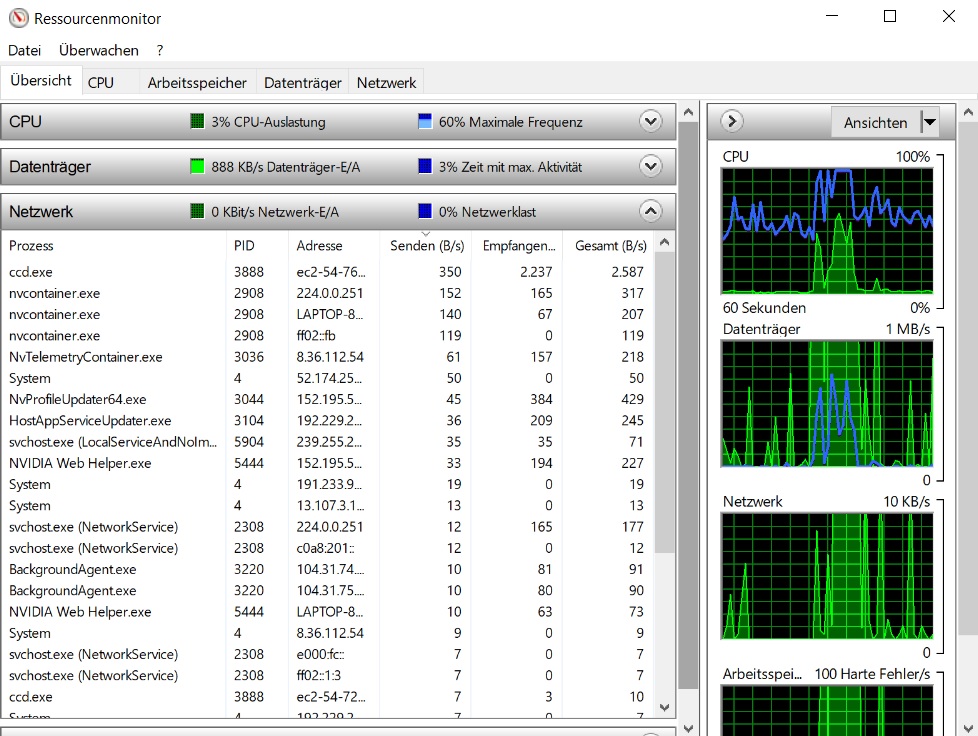 Wir sitzen fast nebeneinander und während mein Ping ständig zwischen 150-181 ms liegt, liegt seiner immer in einem Bereich von 21-30 ms. Automatische Windows Updates habe ich schon ausgeschaltet und mal einen Blick in den Ressourcenmonitor geworfen, allerdings weiß ich nicht so recht was genau ich nun damit anfangen soll da mir die meisten Begriffe einfach nichts sagen. Würde halt schon gerne alles ausschalten was ich nicht brauche. Gebe euch noch ein paar Infos und hänge zwei Bilder an hoffe das hilft etwas
