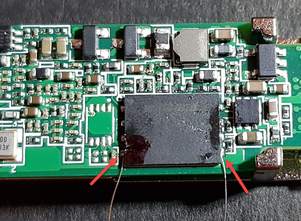 Metalldraht an den beiden äußeren Pins des Flashchips.