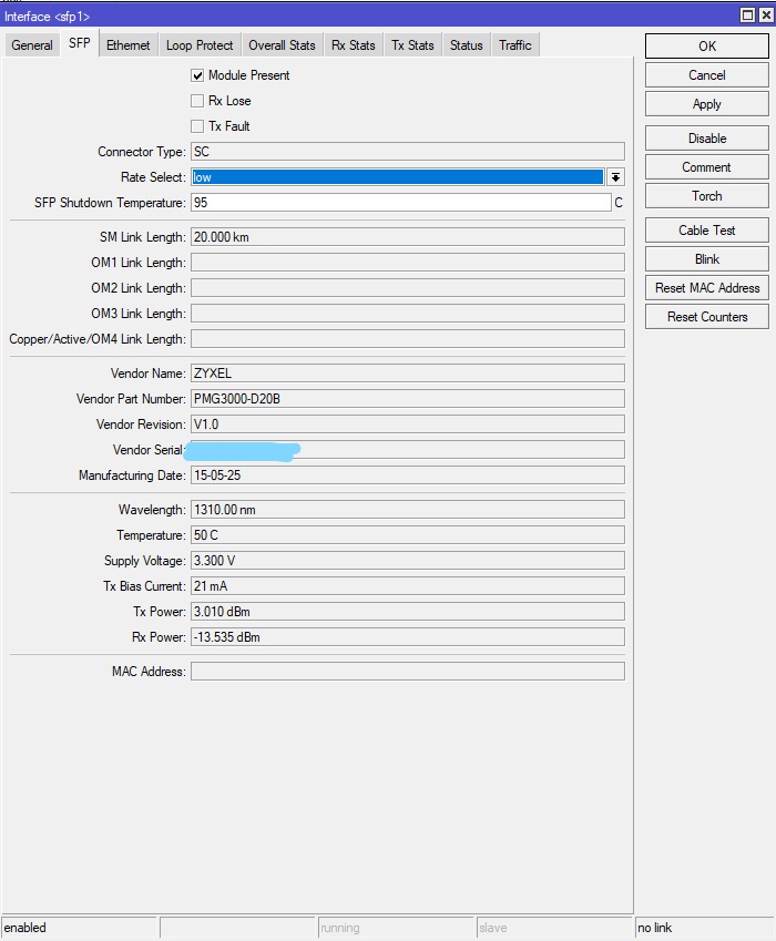 hendrikausb schrieb:Habe ein Mikrotik RB3011. Dieser baut einfach keinen Link auf. Egal ob mit oder ohne Faser. Kannst du sagen ob das RB4011 den link anzeigt auch wenn etwas nicht richtig konfiguriert ist? Schließlich bräuchte ich den link ja auch um mit SSH oder Webinterface darauf zuzugreifen.