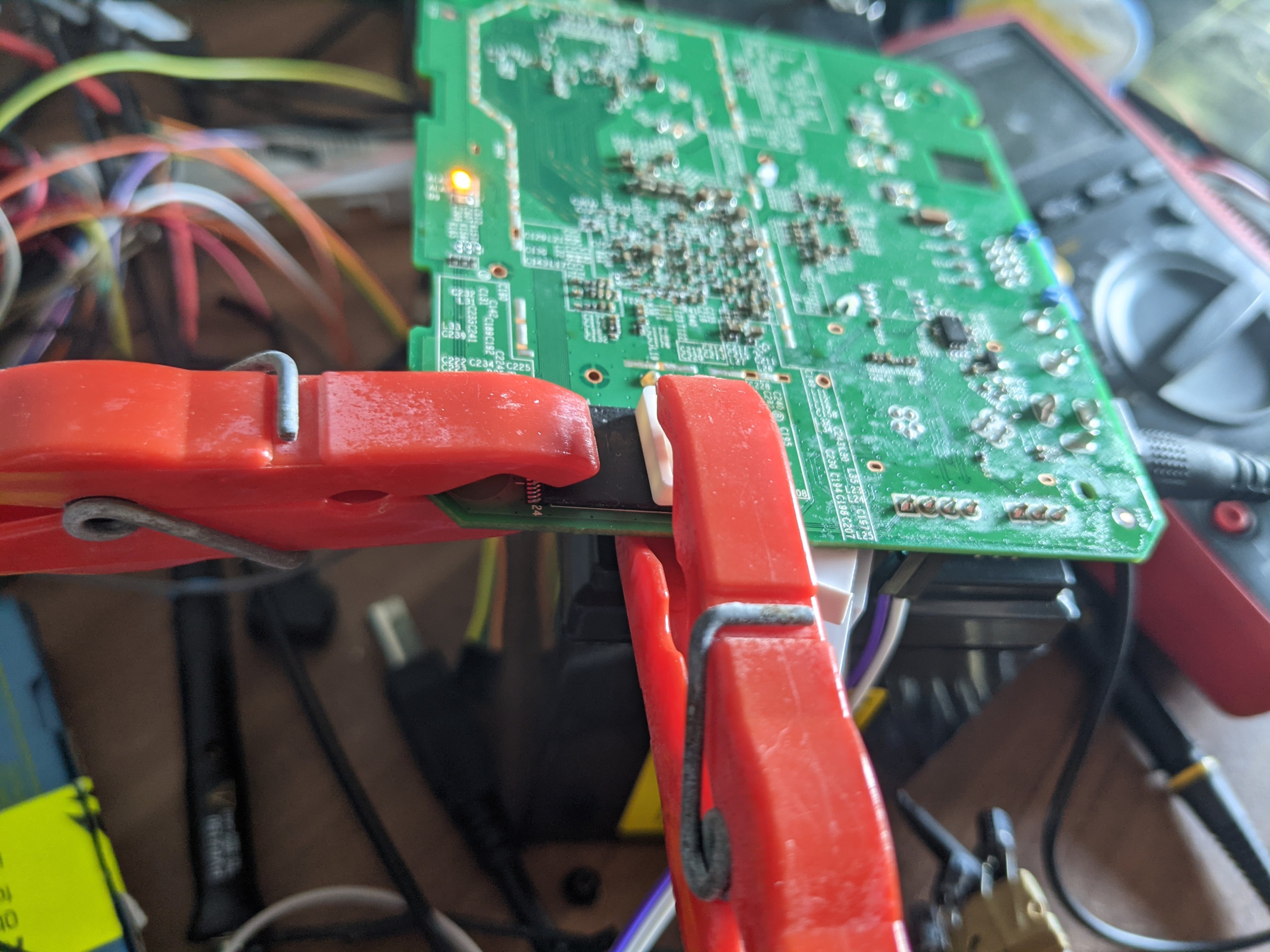 Später hab ich mich dann aber doch entschieden ihn rauszulöten und mitm Sockel in nen Programmer zu stopfen. Zum Testen dann immer mit einer Wäscheklammer wieder auf den Pads positioniert