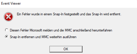 Ein Fehler wurde in einem Snap-In festgestellt und das Snap-In wird entfernt. Welche Option auswählen?