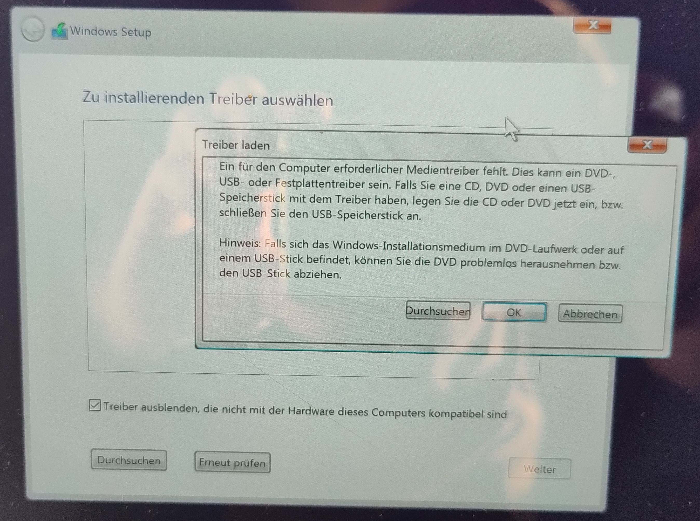 Hallo, ich versuche ein Windows (10 oder 11) via USB-Stick auf ein Surface 7 Pro+ zu installieren, und er gibt mir während der Installation die Meldung "Ein für den Computer erforderlicher Medientreiber fehlt". Ich habe die Datei von der ich annehme daß sie der Treiber ist ( SurfacePro7_Win11_22621_25.043.33302.0.msi ) auf dem Stick geschoben, aber wenn ich auf 'Durchsuchen' gehe erkennt er ihn nicht. Hat jemand einen Tipp?