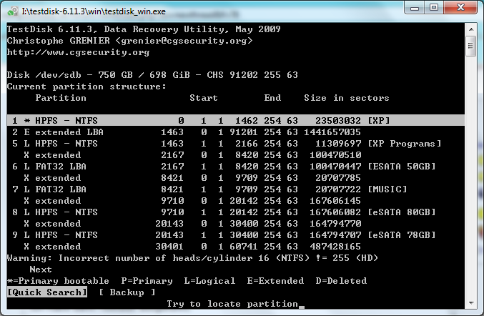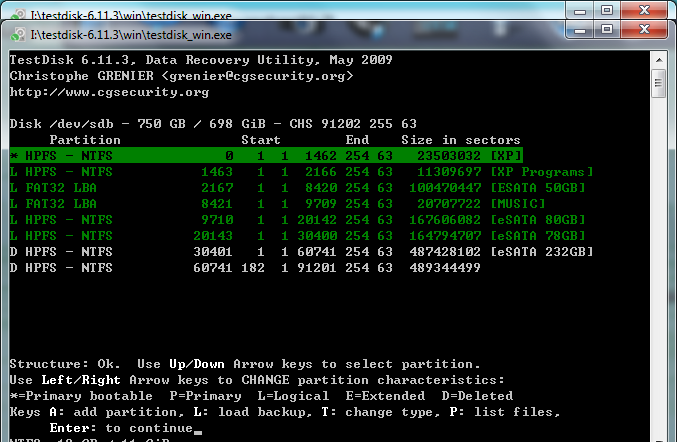 Ich habe dann Testdisk ausgeführt und die Screens von der Analyse (wie versprochen mit viiieelen Partitionen