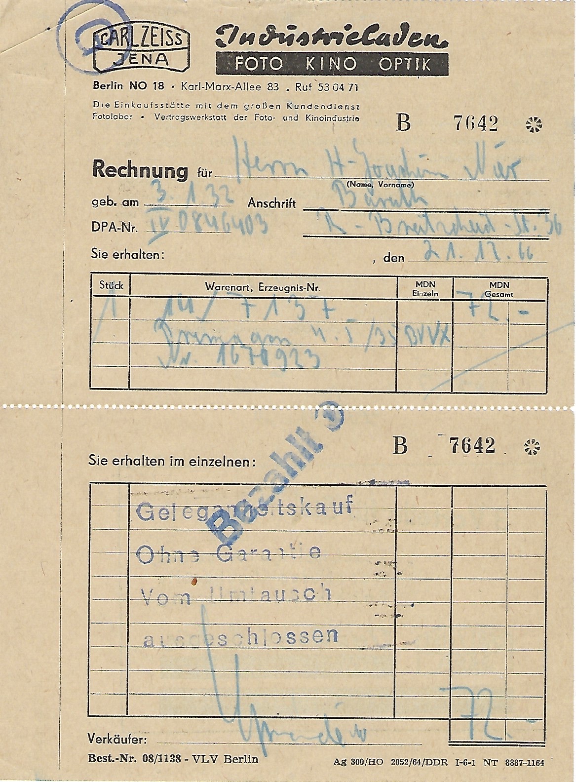 Mein Exemplar wurde am 15.10.1963 gekauft, für 460 Mark. 6.412,70 Mark verdiente mein Großvater damals, im Jahr, 540 Mark pro Monat! Für einen Amateur eine große Investition, zu der noch die Umhängetasche für 60 Mark + Filme (finde gerade nicht den EVP des ORWO Filmes) + Entwicklung kamen.