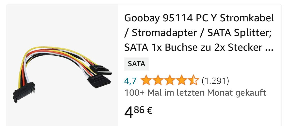Ich möchte zunächst 1 SSD in einen leeren 3,5 Zoll Schacht einbauen. Dafür brauche ich einen Einbaurahmen. Ich möchte einen kaufen der später auch noch eine zweite SSD aufnehmen kann (auf dem Mainboard sind mind. 2 Sata-Anschlüsse frei wenn ich das richtig sehe). Diese Art von Rahmen gibt es überall (außer in meiner 30.000 Einwohner-Stadt). Egal, dann halt Internet. Allerdings bin ich technisch nicht so gut bewandert. An der SSD sind hinten 2 Blöcke mit Pins. Einmal 15 Pins und einmal 7 Pins. An die muss ja ein Kabel ran für die Daten und für den Strom. Sind das dann 2 Kabel oder gibt es SATA III Kabel die sowohl Strom und Daten gleichzeitig abdecken? Es ist eine Samsung 860 QVO SSD mit 1TB.