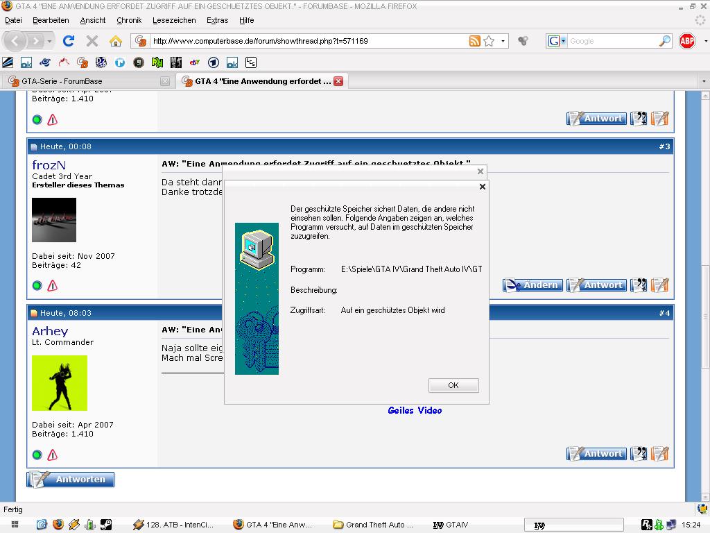 Wenn ich im Internet bin und Gta IV starten moechte, startet er das Spiel und ein schwarzer Bildschrim erscheint nach den Logos. Wenn ich dann auf den Desktop switche kommt diese Meldung (siehe Anhang)