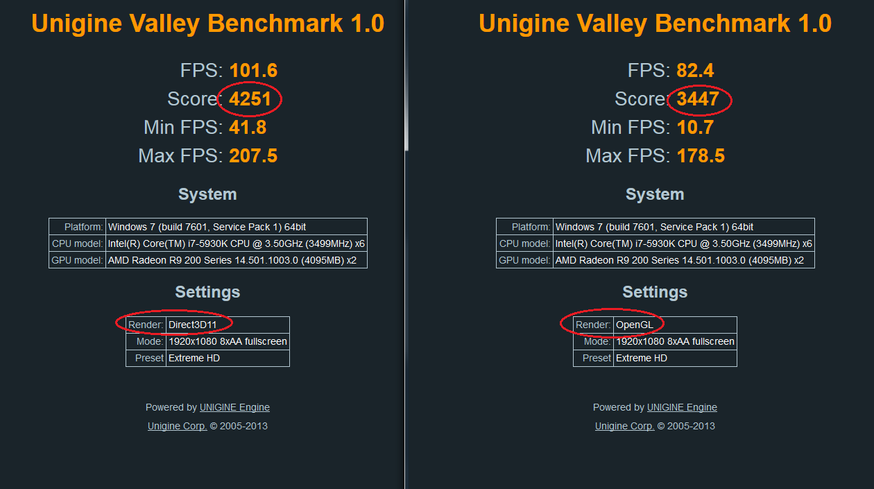 Interessant, wie unterschiedlich die Performance ist: beim CPU-Limit ist OpenGL schneller, beim GPU-Limit dann DX11. Wie ist denn nun der Unterschied zwischen der 780 und der 290? Was liest Du raus bzw. welche Erkenntnis nimmst Du für Dich mit?