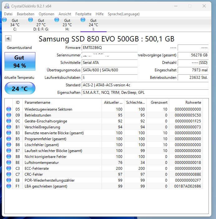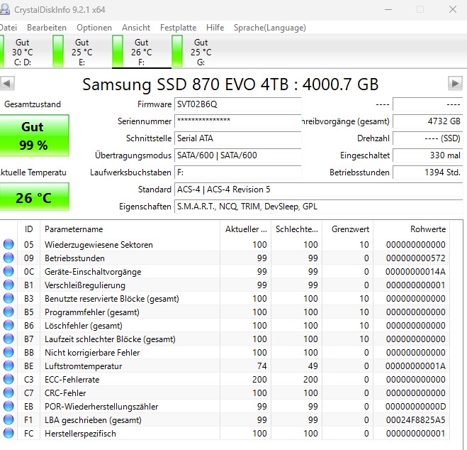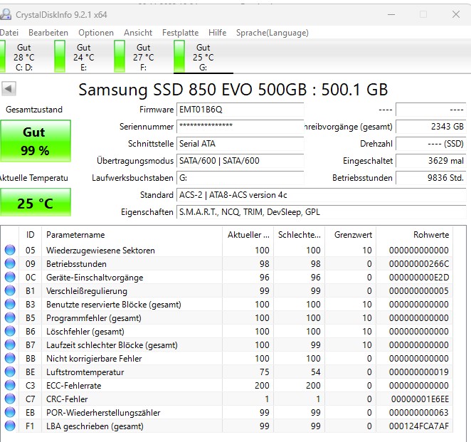 Natürlich frage ich mich, ob ich mir um die betroffene SSD Sorgen machen muss. Von den Daten mache ich (ziemlich regelmässig) Backups. Hier die Daten von CrystalDiskInfo: