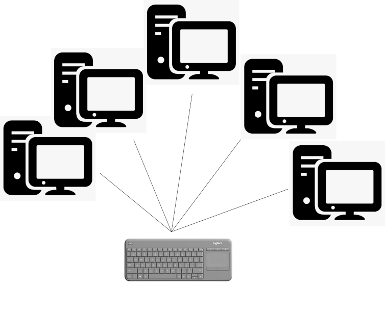zb. auf allen rechnern ist word geöffnet: ich drücke "a" und bei allen fünf rechnern taucht das "a" in word auf.