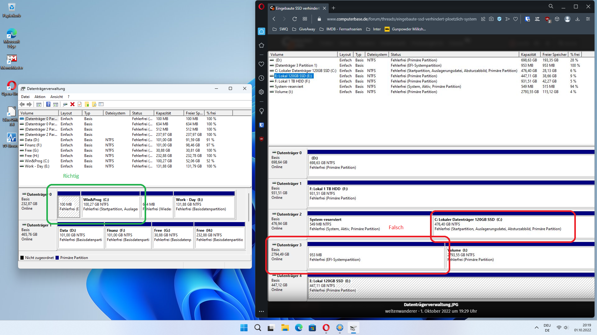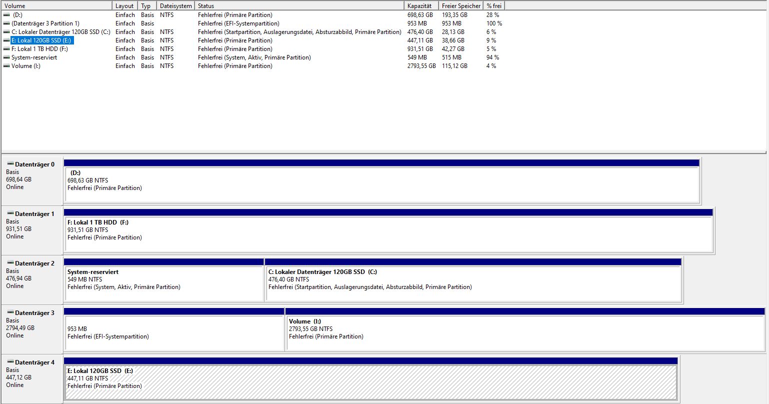 In meinem Rechner sind zwei HDDs und zwei SSDs eingebaut. Bis gestern lief alles normal, aber heute früh bleibt der Rechner beim BIOS stehen. Ich dachte erst, es läge an den RAMs, aber nach vielem rumprobieren habe ich festgestellt, dass der Rechner wieder startet, wenn ich das SSD Laufwerk E:\ abklemme. Ich habe daraufhin die Kabel mit denen der anderen Platten mal getauscht … an den Kabeln kann es nicht liegen. Egal wo, sobald ich Laufwerk E:\ anklemme, gibts wieder keinen boot. Seltsam ist aber, dass ich die besagte SSD an einen externen SSD-USB Konnektor anschließen kann und sie wird sofort erkannt.
